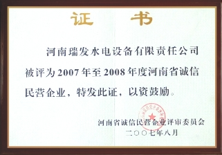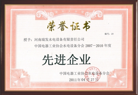 河南瑞发公司系国内知名水轮发电机组专业生产企业、全国水电设备行业先进企业、全国优秀水利企业、河南省质量信得过企业、河南省知名商品企业、河南省高新技术企业、水利部部级先进企业、中国质量认证中心ISO9001:2000质量体系认证通过企业、中国电器工业协会水电设备分会及风力发电理事单位;公司连续10年在水电设备行业排序中,产品销售率、综合效益指数均位居全行业前十...... [