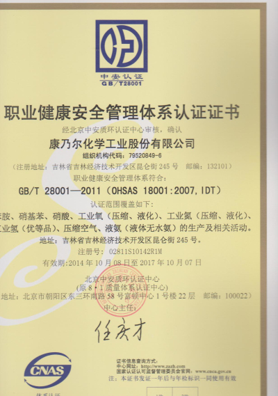 职业健康安全管理体系认证证书